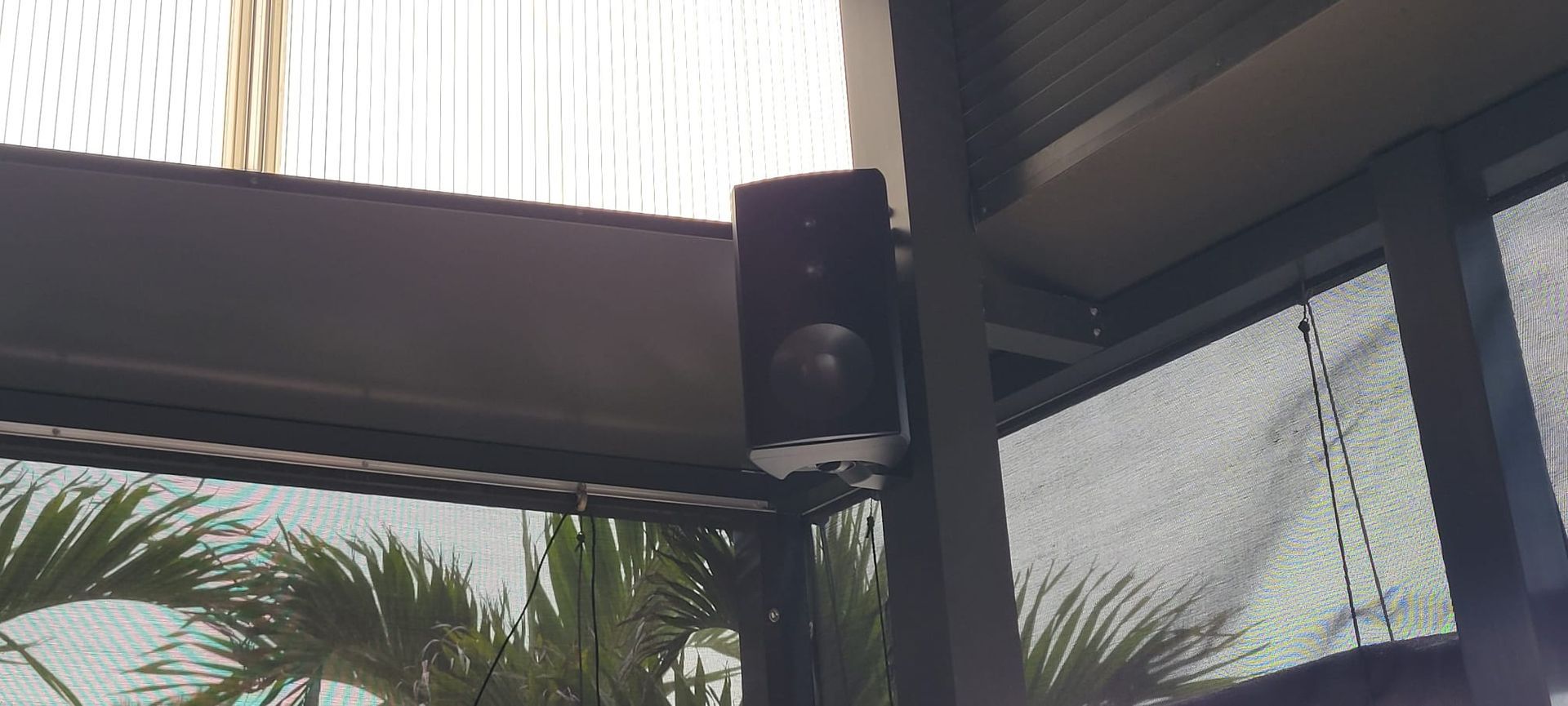 - Bracketed speakers around the perimeter